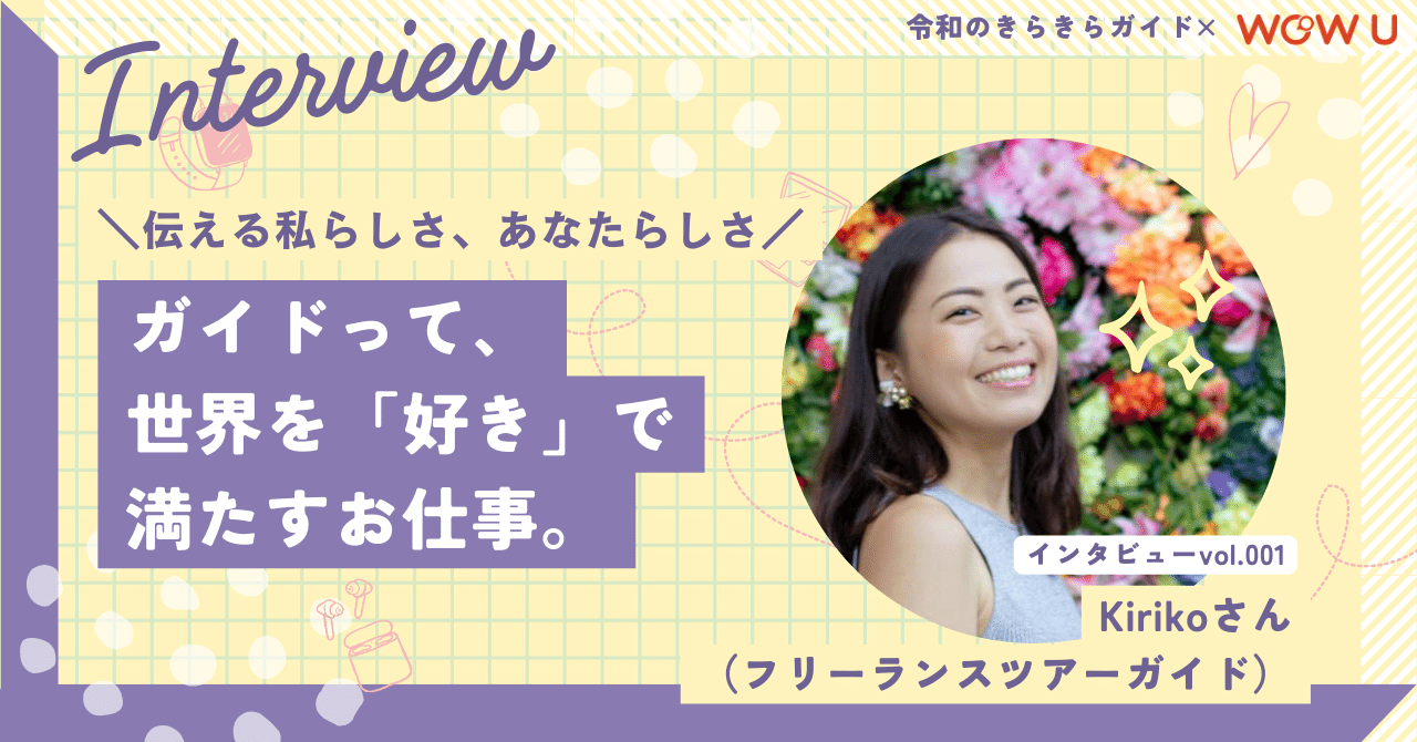 毎年3ヶ月は長期休暇?!日本の魅力を伝える観光ガイドの働き方|令和のきらきらガイド×WOW U【インタビュー①:Kirikoさん】|【公式】EXest株式会社(エグゼスト)✅記事の内容まとめ✅ ・プロとして活動するフリーランスガイドのKirikoさんにインタビュー🎤 ・ガイドの仕事内容や向き不向き、報酬、必要な資格について💰 ・Kirikoさんがガイド活動を始めたきっかけや、初期の案件獲得方法 ・「毎年夏と冬は、長いお休みを取る」✨ ガイドの自由な働き方とは ・ガイドの魅力についてもうかがいました ✨この記事はこんな人におすすめ✨ ・ガイドの仕事内容に興味がある人 ・語学力を使った仕事がしたい人 ・働き方を模索中の人 ・人を笑顔にさせる働き方がしたい人 ・地方に住みながら働く方法を探している人 「あなたが私の、日本代表」。 世界中の人々https://note.com/exest_official/n/n4d1d06293b53
